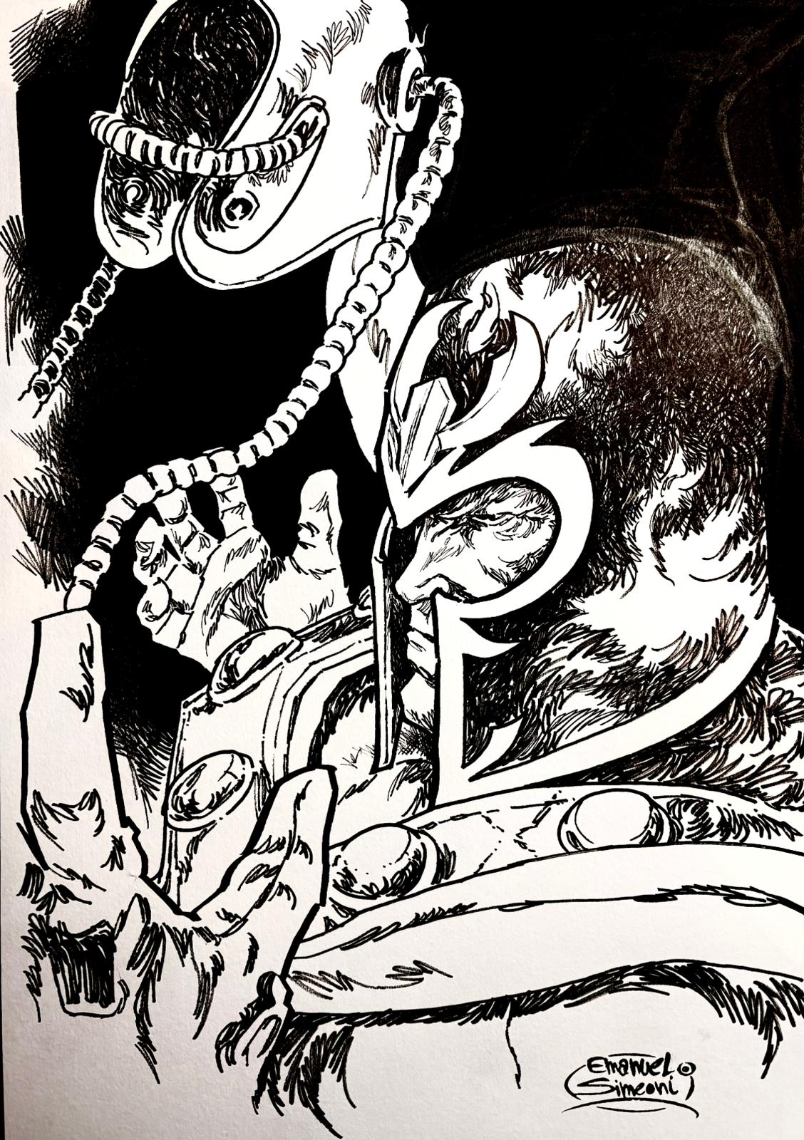 Questa straordinaria illustrazione di Emanuel Simeoni presenta il Maestro del Magnetismo in una composizione drammatica e teatrale. L'artista cattura perfettamente l'essenza del personaggio attraverso un uso magistrale del contrasto bianco-nero, dove le linee fluide e dinamiche evocano l'energia magnetica che circonda Magneto.