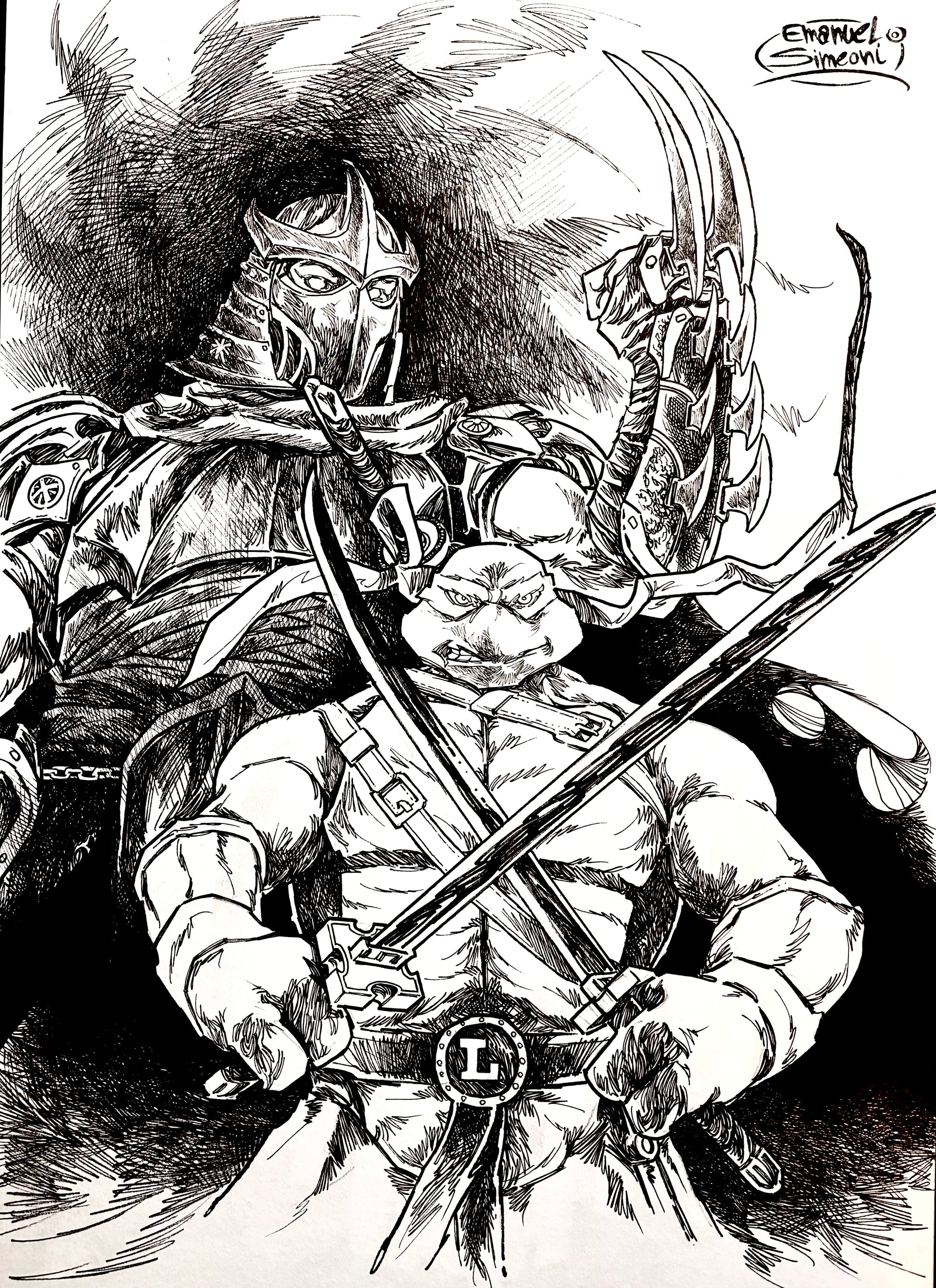 Un'opera d'arte originale realizzata a inchiostro da Emanuel Simeoni, che cattura l'essenza dinamica e potente delle iconiche Tartarughe Ninja.